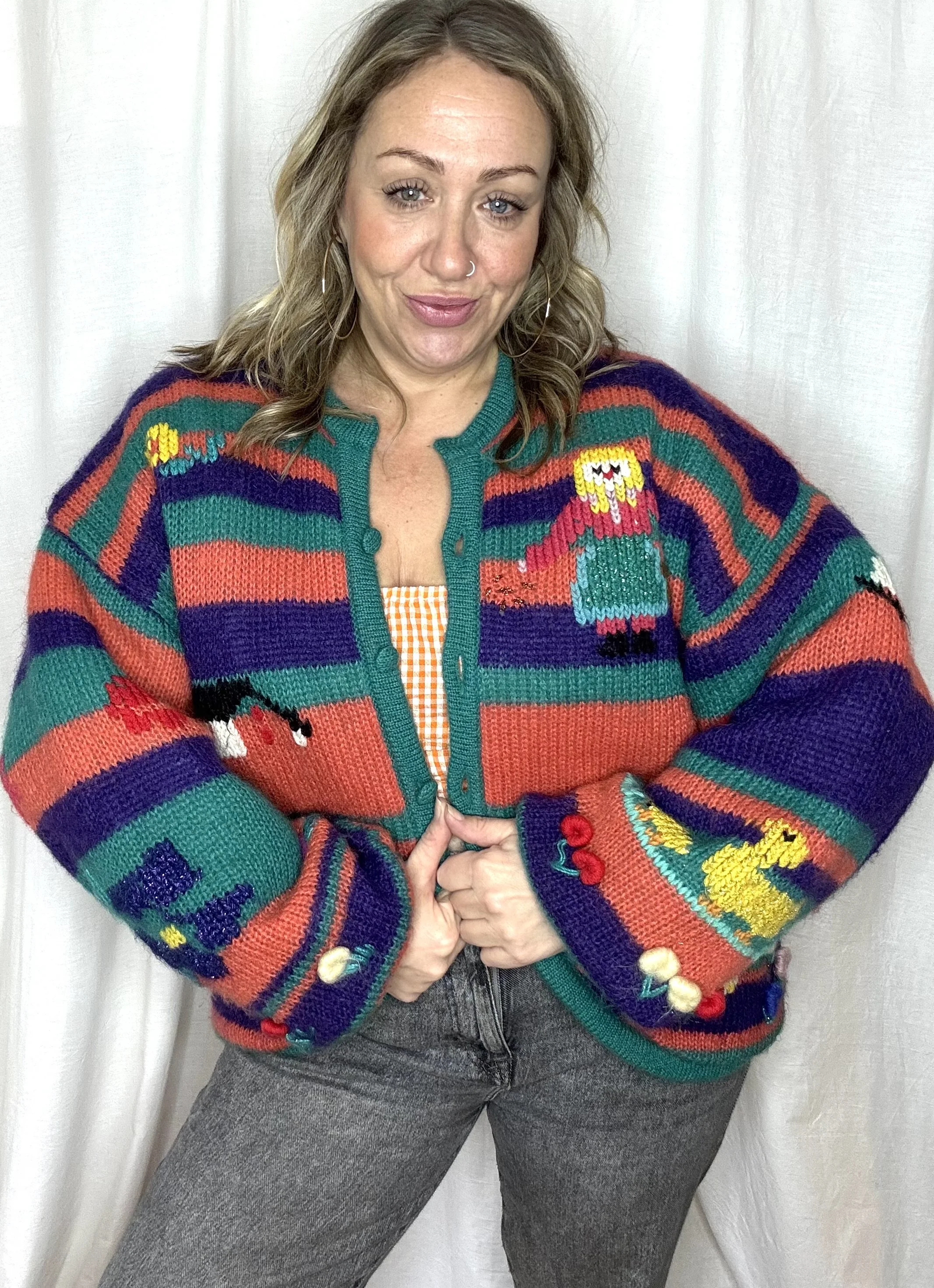 The most adorable chunky knit cardigan with a novelty farmyard theme. Featuring metallic and 3D details. It is lightly padded with a green satin quilted lining and has fabulous balloon sleeves. Finished off with matching green wool covered buttons and a curved hem.